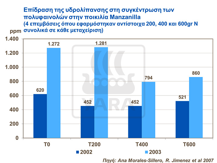 Ο ανταγωνισμός μεταξύ των θρεπτικών στοιχείων είναι παράγοντας που μπορεί να μειώσει την τελική απόδοση των δένδρων, όπως διαπιστώθηκε σε πειραματικές εφαρμογές σε ελιές της ποικιλίας Manzanilla . Το διάγραμμα που ακολουθεί παρουσιάζει την απόδοση του ελαιολάδου σε πολυφαινόλες για διαφορετικές εφαρμογές υδρολίπανσης, σε διάστημα 2 ετών.