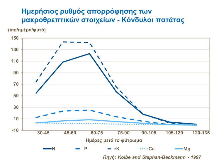 Η πρόσληψη των μακροθρεπτικών στοιχείων μεταβάλλεται ανάλογα με το στάδιο ανάπτυξης της καλλιέργειας όπως φαίνεται στο παρακάτω διάγραμμα.