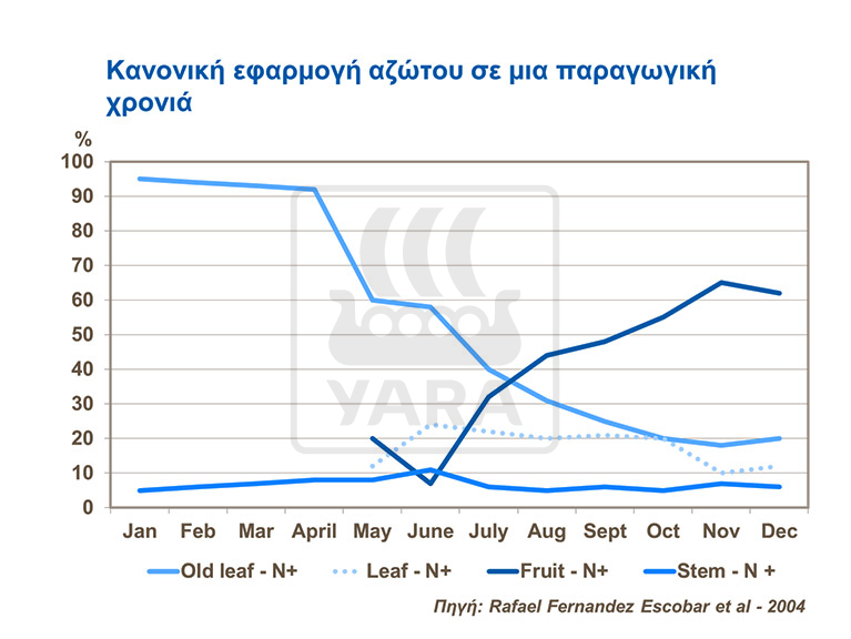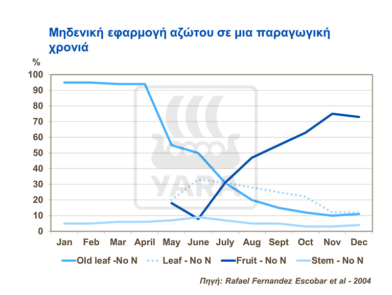 Η εφαρμογή του αζώτου κατά τη διάρκεια του έτους που η καλλιέργεια παρενιαυτοφορεί έχει ιδιαίτερη σημασία, καθώς το θρεπτικό στοιχείο αποθηκεύεται στο φυτό για την επόμενη χρονιά. Κατά τη διάρκεια των ετών της παρενιαυτοφορίας, η ικανότητα των δένδρων να αποθηκεύουν θρεπτικά στοιχεία στα φύλλα είναι μεγαλύτερη σε σχέση με τις παραγωγικές χρονιές, επειδή το άζωτο που απαιτείται για την υποστήριξη της ανάπτυξης των φυτών δεν χρησιμοποιείται πλήρως.