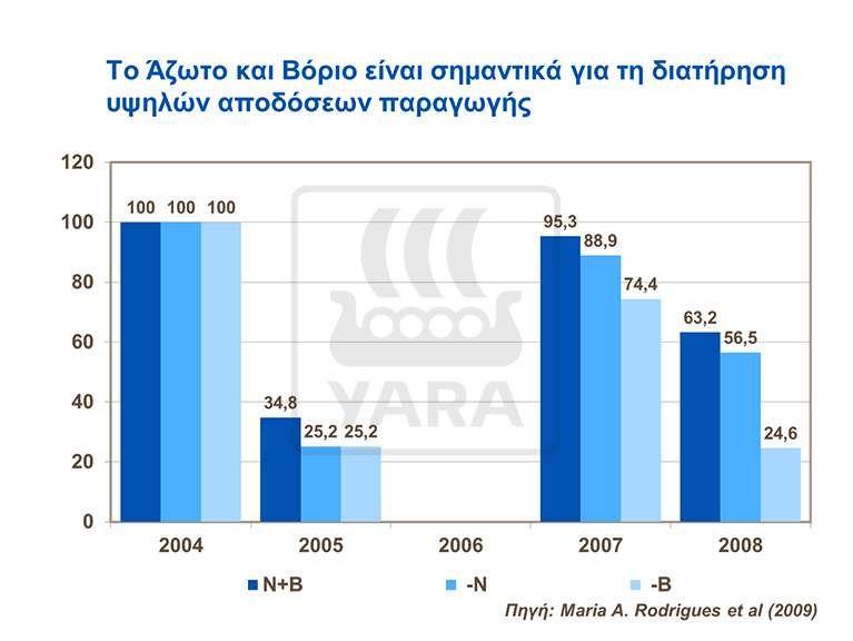 Οι εφαρμογές βορίου και αζώτου που παρουσιάζονται στα διαγράμματα οδηγούν σε αύξηση της απόδοσης του ελαιώνα, σε σχέση με τον μάρτυρα στον οποίο δεν εφαρμόστηκαν λιπάσματα για μία περίοδο 4 ετών. Το εδαφικό βόριο και άζωτο εξαντλούνται όταν δεν ανανεώνονται στον ελαιώνα. Ελάχιστη ή καθόλου προσθήκη θρεπτικών στοιχείων στο έδαφος μπορεί να οδηγήσει σε μείωση της συγκέντρωσης του αζώτου στα φύλλα σε τιμές χαμηλότερες από το κρίσιμο όριο του 1,5%, που είναι και η επιθυμητή κατάσταση.